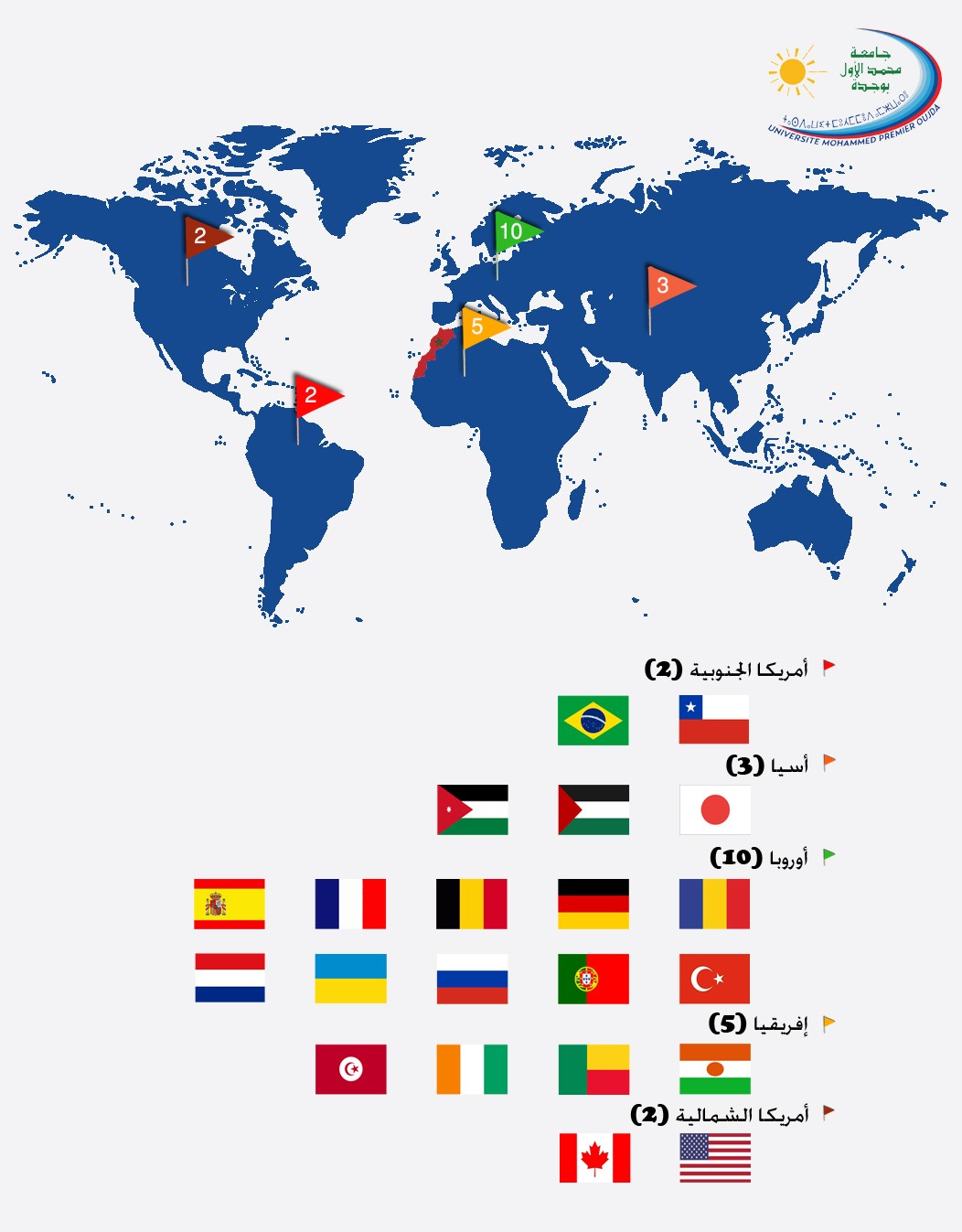 تشاهدون أسفله، خريطة التعاون الدولي لجامعة محمد الاول عبر العالم، والتي تلخص مجموعة من الدول التي وقعت معها الجامعة عدد من الاتفاقيات منذ سنة 2014.