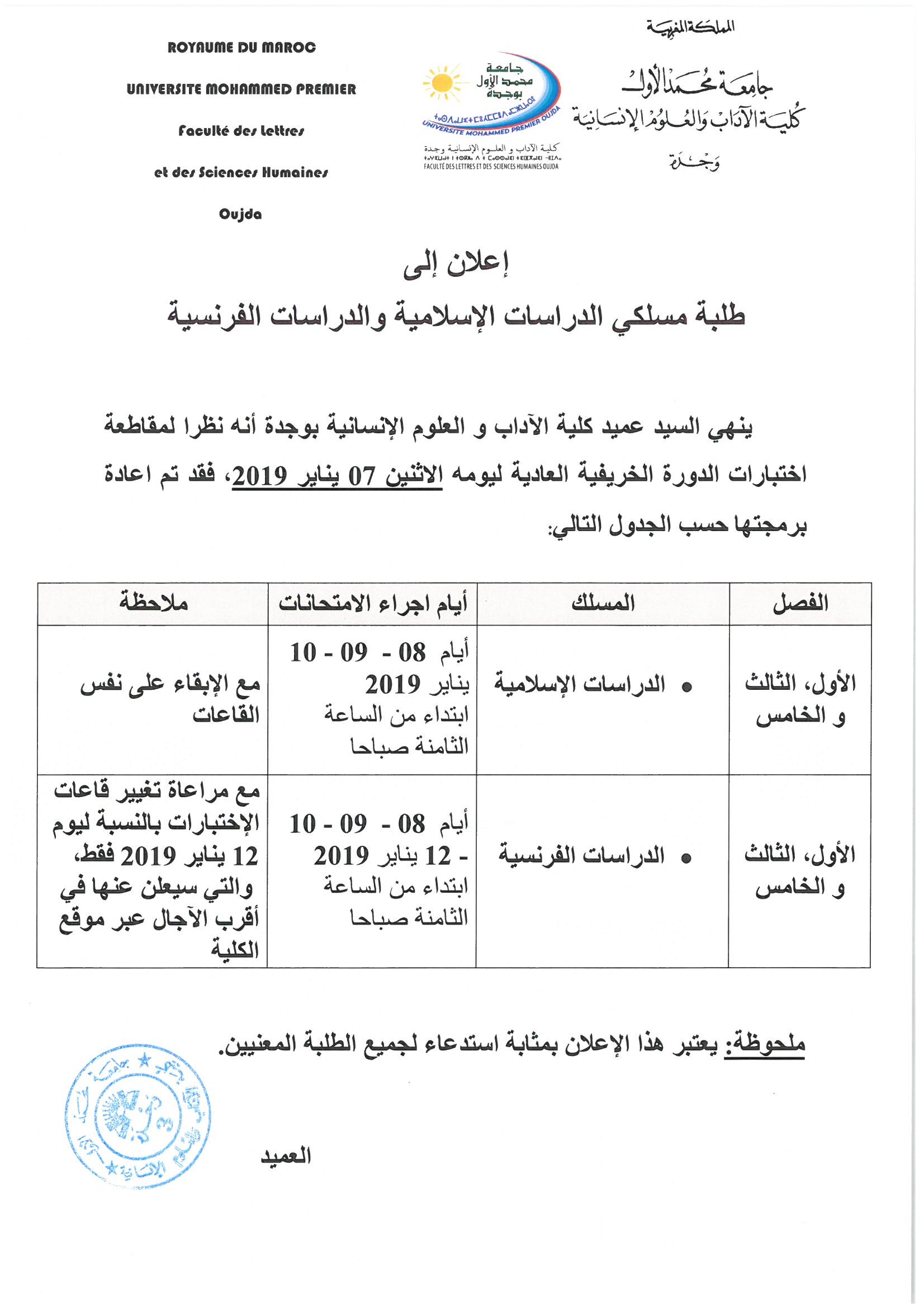 إعلان إلى طلبة مسلكي الدراسات الإسلامية والدراسات الفرنسية