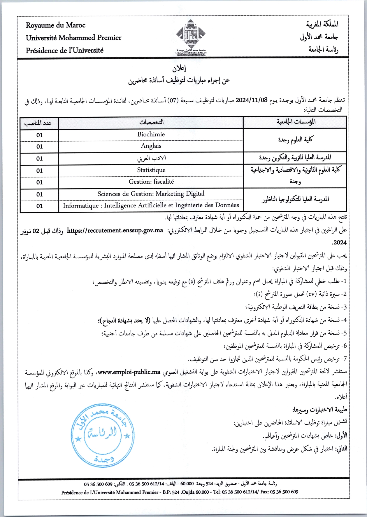 اعلان عن اجراء مباريات لتوظيف أساتذة محاضرين
