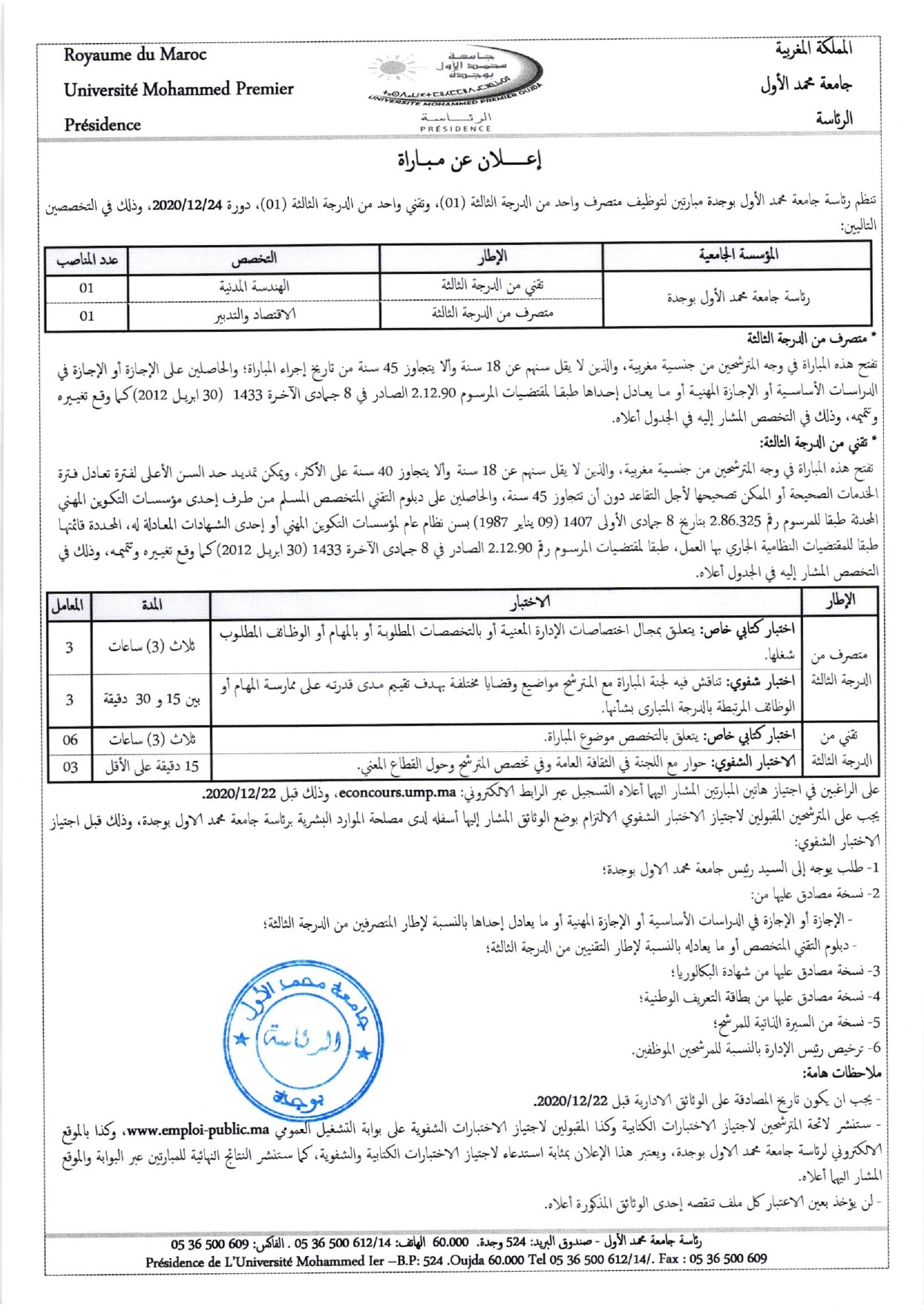 إعلان عن مـباراة - رئاسة جامعة محمد الأول بوجدة