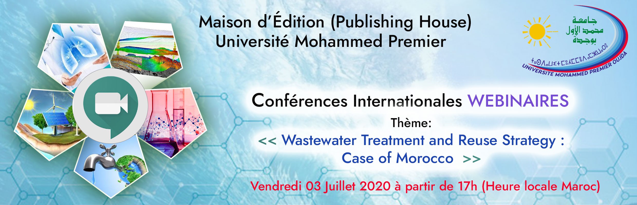 La Maison d’édition (Publishing House PHUMP) de l’Université Mohammed Premier organise 6ème Webinaire Conférence Internationale sous le thème : «Wastewater Treatment and Reuse Strategy : Case of Morocco» qui aura lieu le Vendredi 03 Juillet 2020 à partir de 17h, (heure locale Maroc).
