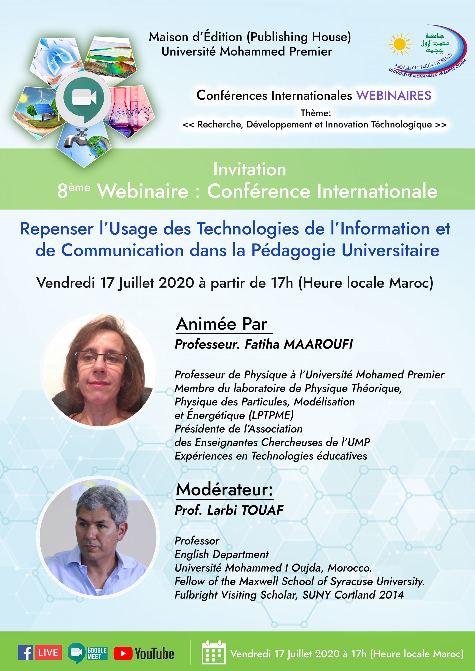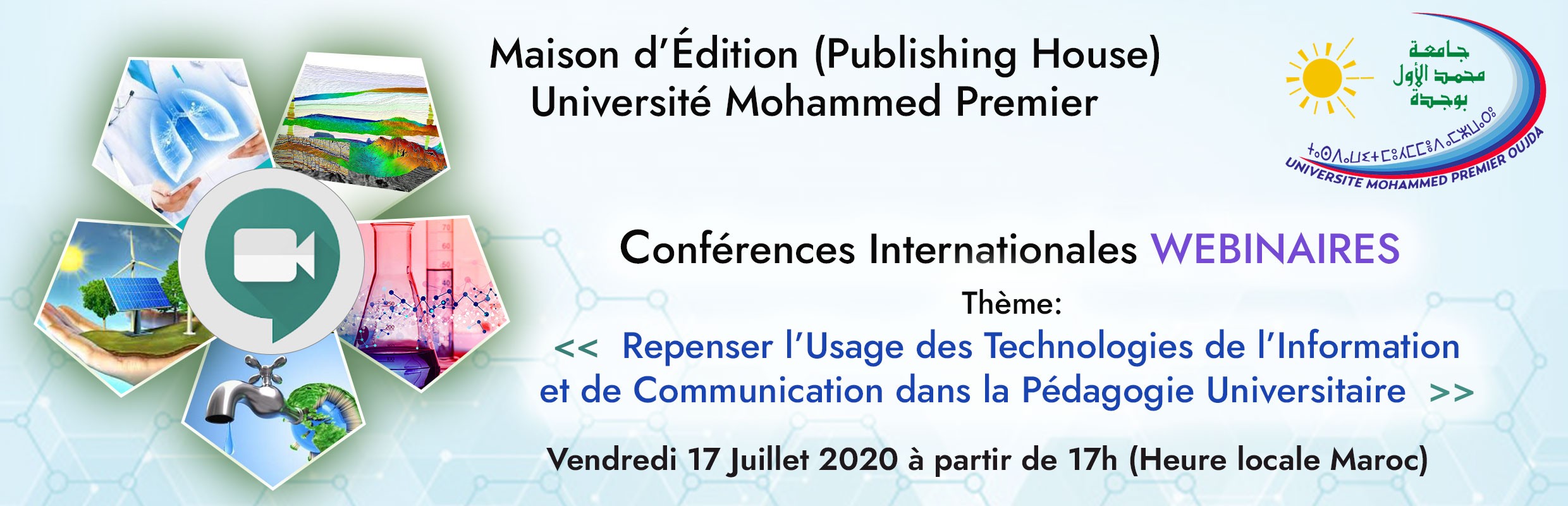 La Maison d'Édition (Publishing House PHUMP) de l’Université Mohammed Premier organise 8ème Webinaire Conférence Internationale sous le thème : «Repenser l'Usage des Technologies de l'Information et de Communication dans la Pédagogie Universitaire» qui aura lieu le Vendredi 17 Juillet 2020 à 17h, (heure locale Maroc).