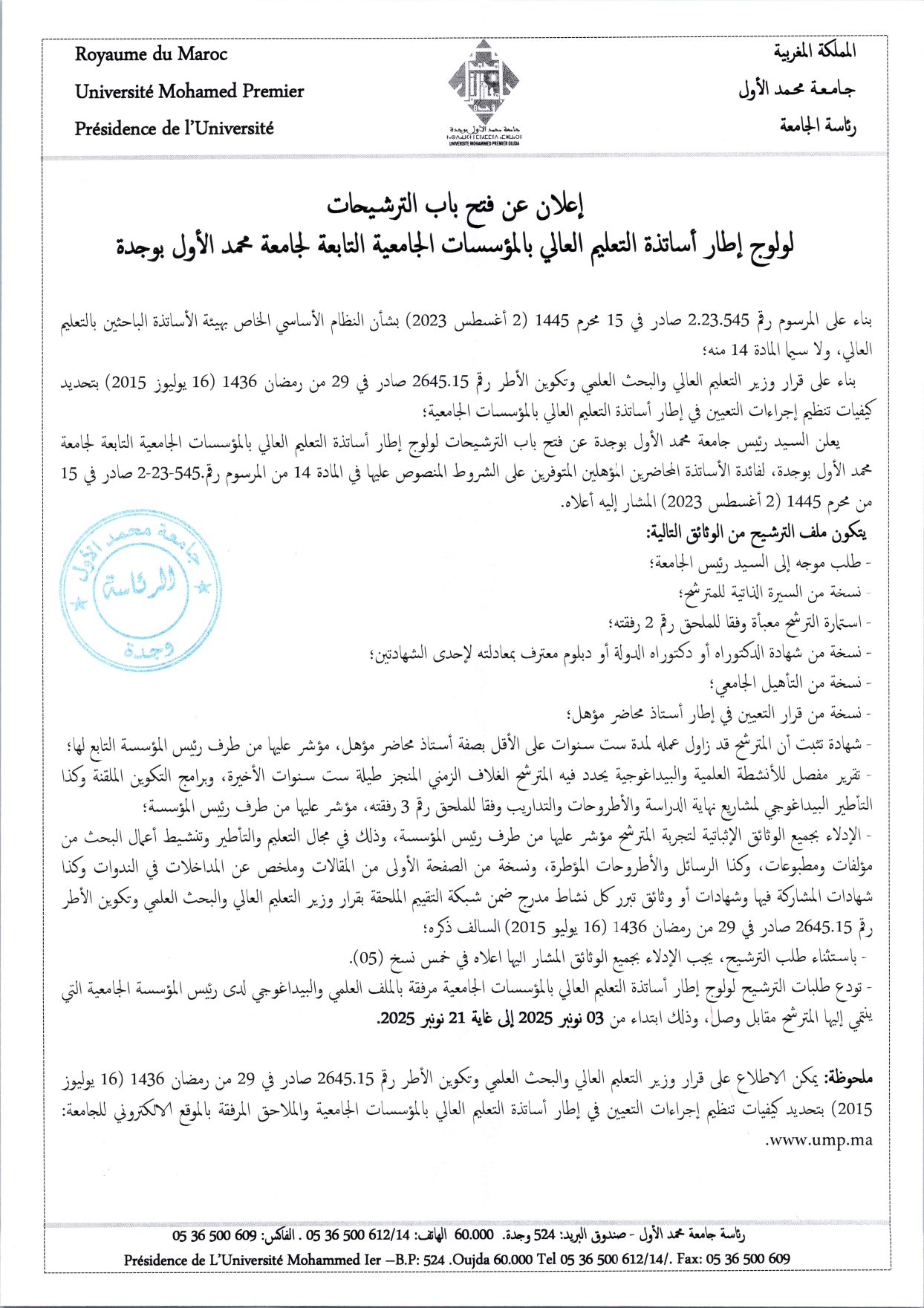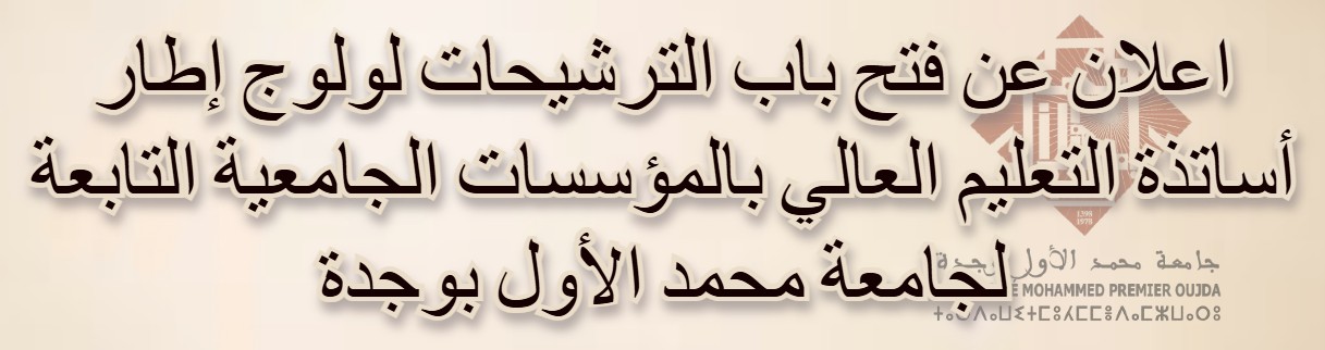 اعلان عن فتح باب الترشيحات لولوج إطار أساتذة التعليم العالي بالمؤسسات الجامعية التابعة لجامعة محمد الأول بوجدة اعلان قرار وزير التعليم العالي والبحث العلمي وتكوين الأطر رقم 2645.15 صادر في 29 من رمضان 1436 (16 يوليوز 2015) ملحق رقم 1 شبكة التقييم ملحق رقم 2 استمارة المترشح ملحق رقم 3 جدول وصفي مفصل للتدريس بمختلف المستويات