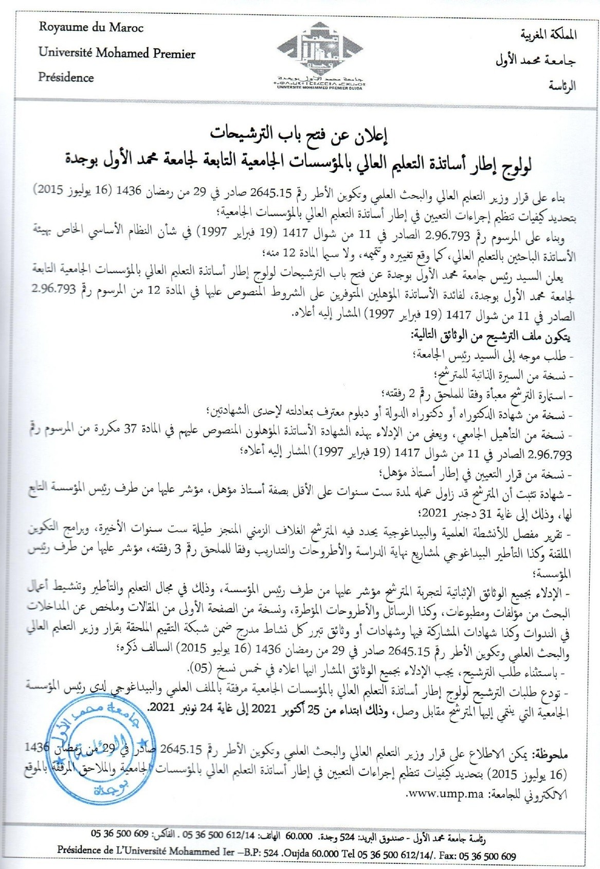 اعلان فتح باب الترشيحات لولوج اطار استاذ التعليم العالي قرار وزير التعليم العالي والبحث العلمي وتكوين الأطر رقم 2645.15 صادر في 29 من رمضان 1436 (16 يوليوز 2015) ملحق رقم 1 شبكة التقييم ملحق رقم 2 استمارة المترشح ملحق رقم 3 جدول وصفي مفصل للتدريس بمختلف المستويات