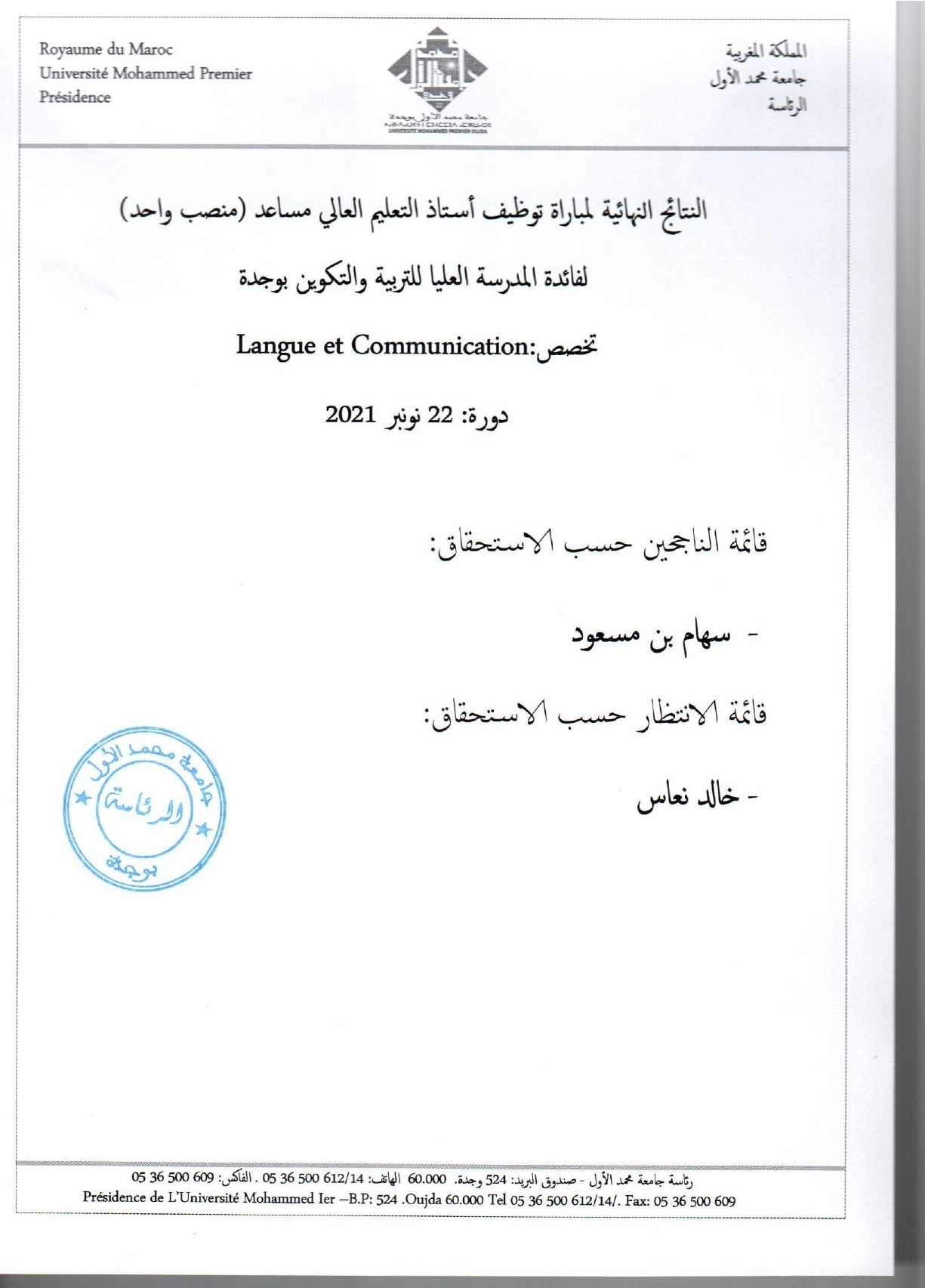 النتائج النهائية لمباراة توظيف أستاذ التعليم العالي مساعد لفائدة المدرسة العليا للتربية و التكوين بوجدة