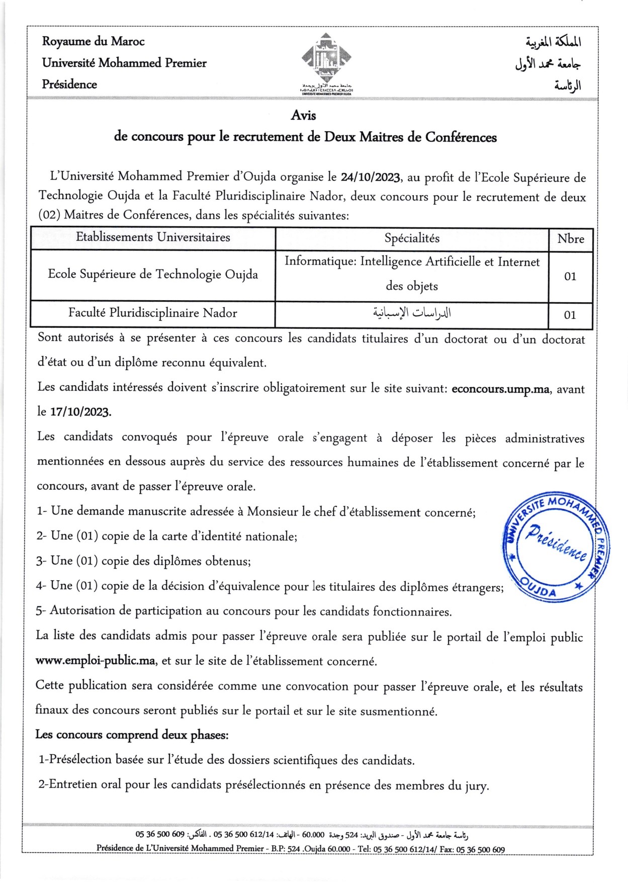 Avis de concours pour le recrutement de Deux Maitres de Conférences