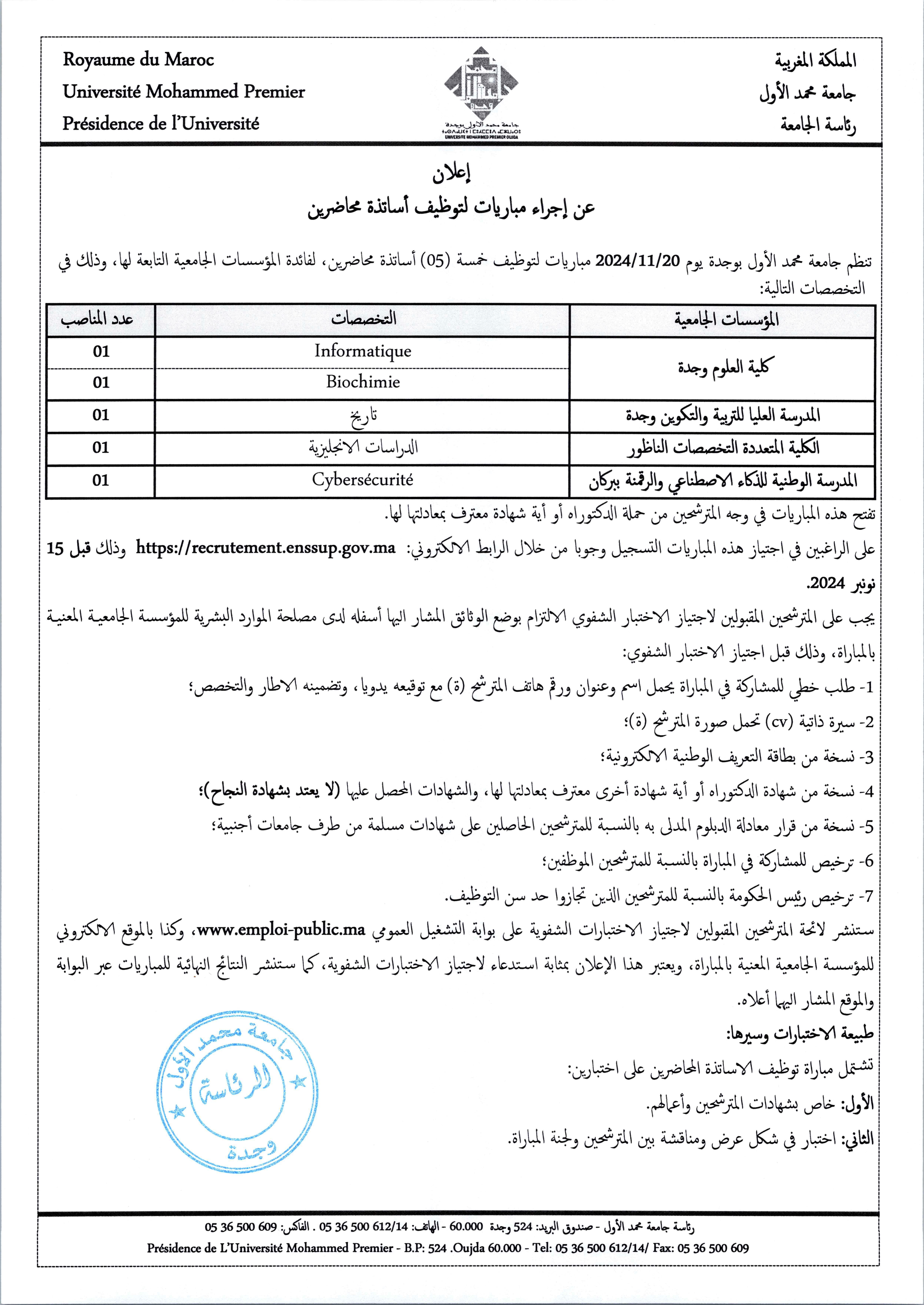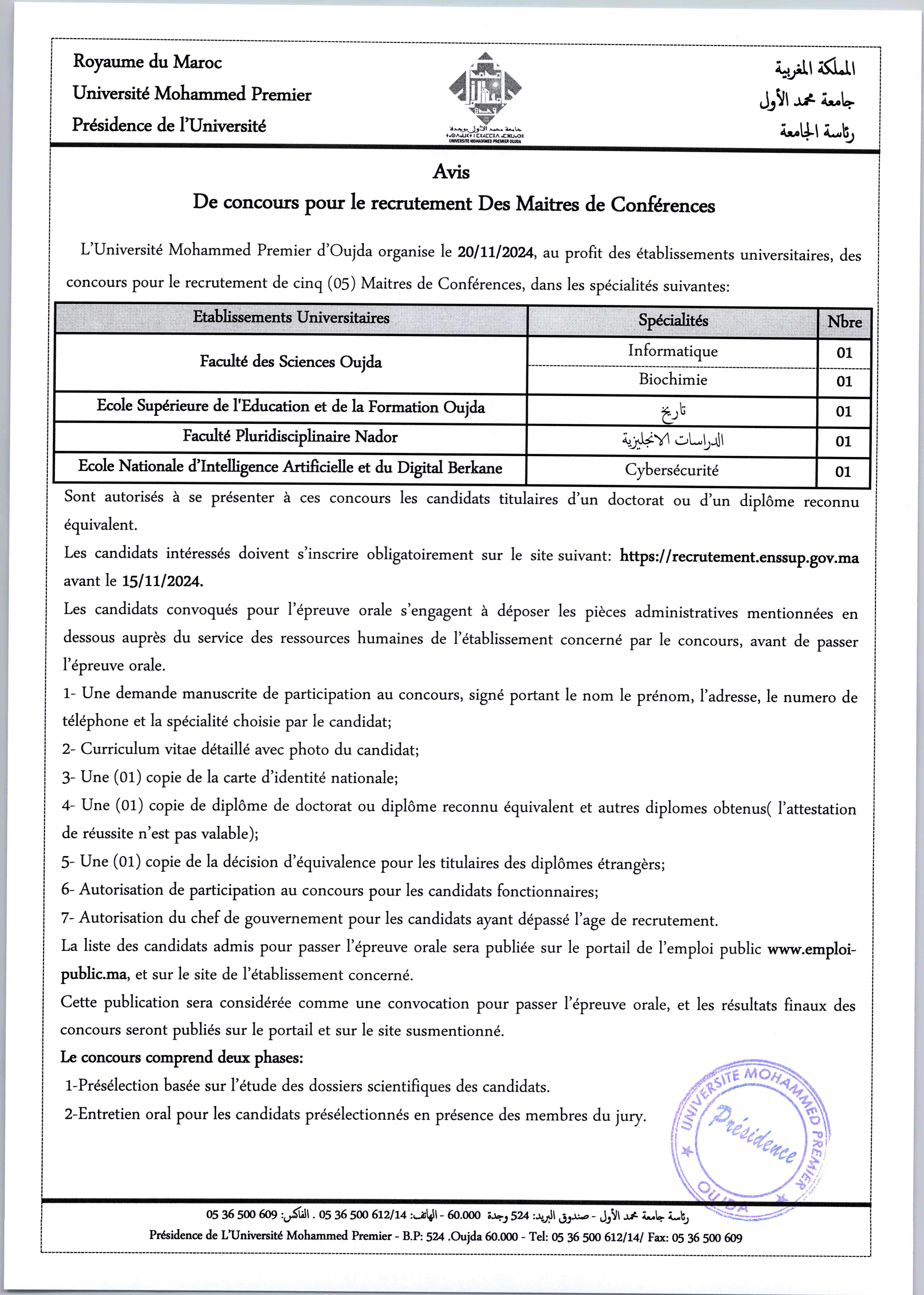 Avis de concours pour le recrutement des Maitres de Conférences Session 20/11/2024
