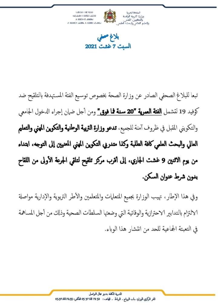 بلاغ صحفي - استفادة الطلبة والمتدربين البالغين سن 20 سنة فما فوق من التلقيح