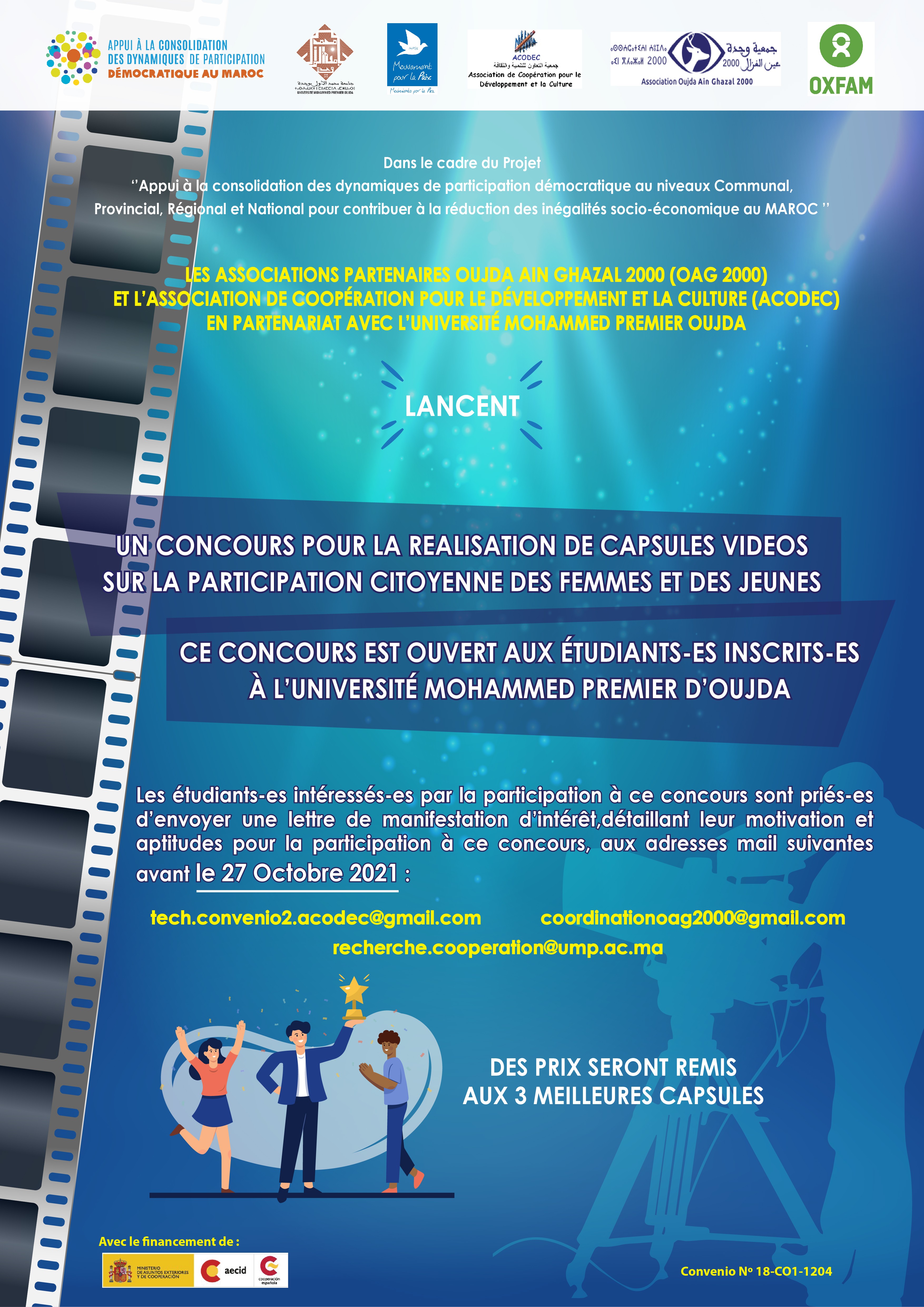 Dans le cadre du projet « Appui à la consolidation des dynamiques de participation démocratique au niveau communal, provincial, régional et national pour contribuer à la réduction des inégalités socioéconomique au Maroc », en partenariat avec OXFAM Maroc et MPDL, avec l’appui financier de L'Agence Espagnole pour la Coopération Internationale au Développement (AECID). Les deux associations partenaires Oujda Ain Ghazal 2000 et l’Association de Coopération pour le Développement et la Culture ACODEC, lancent en partenariat avec l’Université Mohammed Premier Oujda, un concours pour les étudiants-es portant sur « La conception et la réalisation de capsules vidéo de sensibilisation visant la participation citoyenne des femmes et des jeunes »