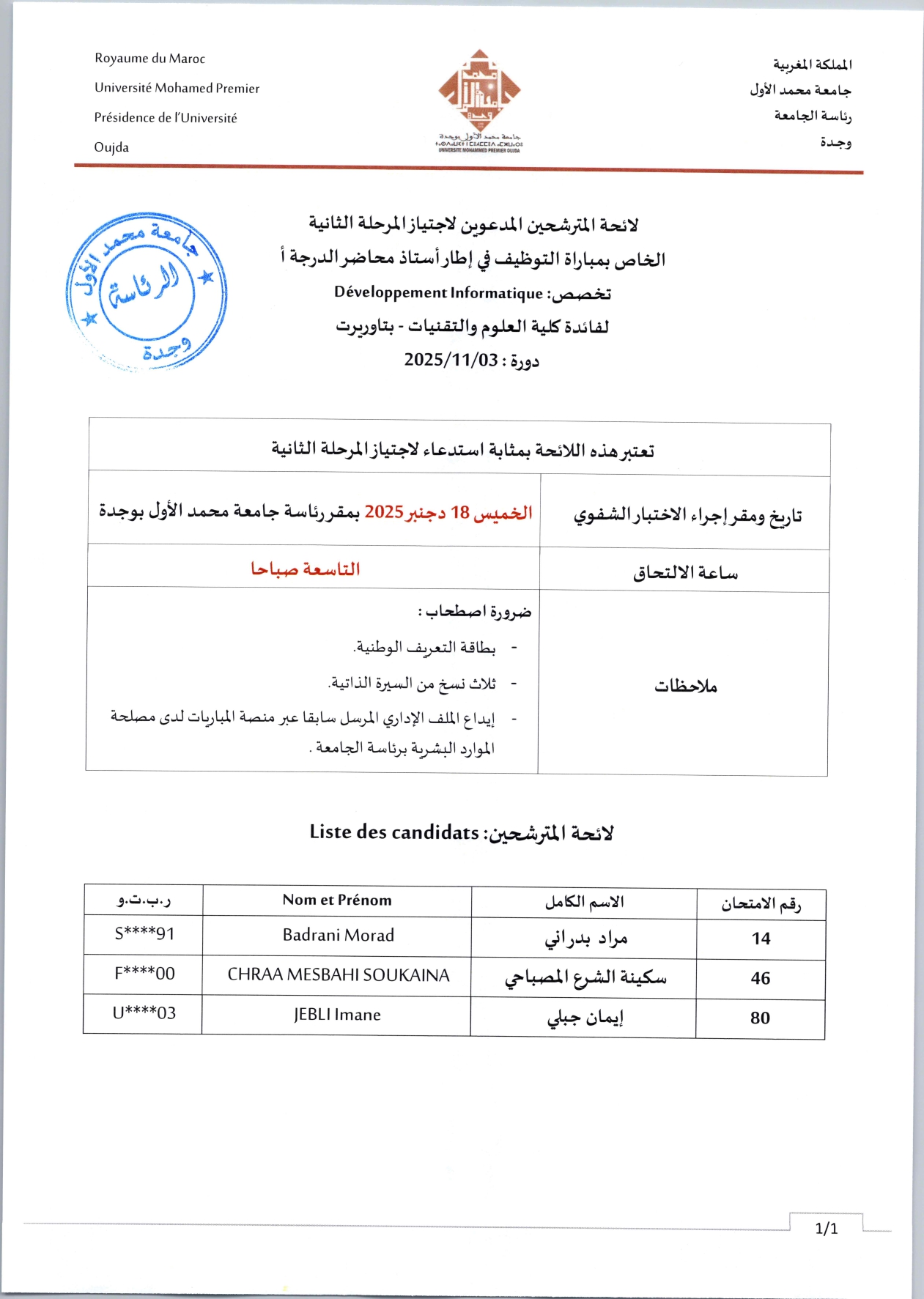 Développement Informatique : لائحة المترشحين المدعوين لاجتياز المرحلة الثانية الخاص بمباراة التوظيف في إطار أستاذ محاضر الدرجة أ تخصص
