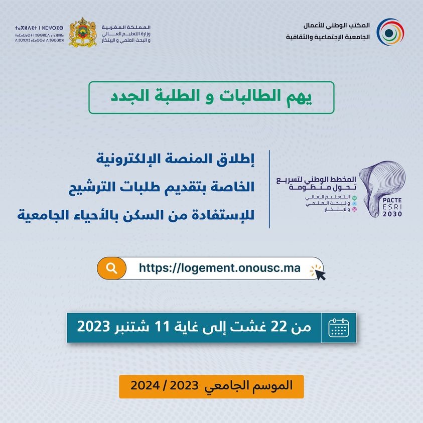 فتح باب الترشيح للاستفادة من السكن بالأحياء الجامعية برسم الموسم الجامعي2023-2024، ابتداء من 22 غشت إلى غاية 11 شتنبر 2023.
