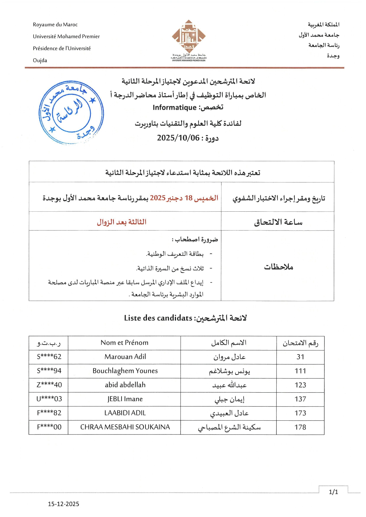 Informatique :لائحة المترشحين المدعوين الاجتياز المرحلة الثانية الخاص بمباراة التوظيف في إطار أستاذ محاضر الدرجة أ, تخصص