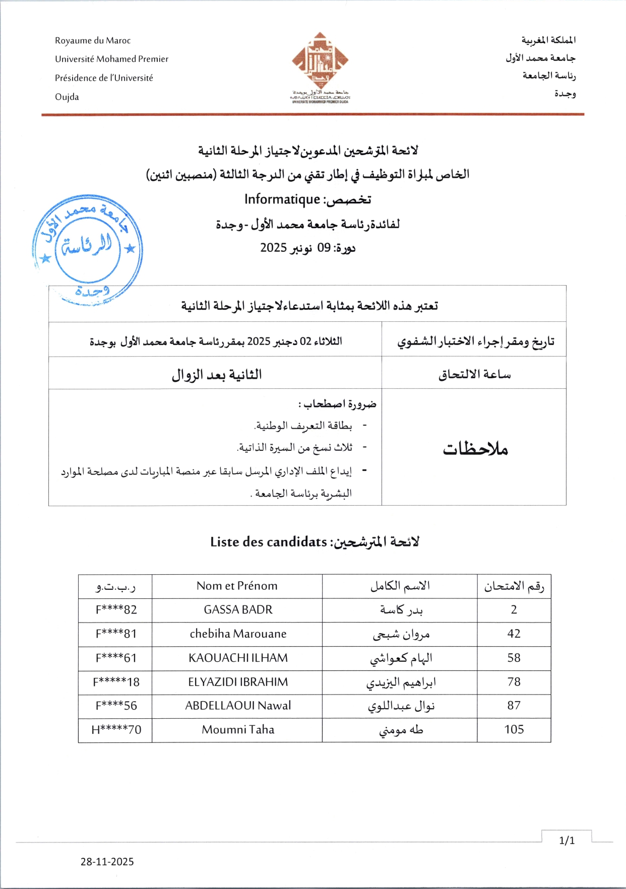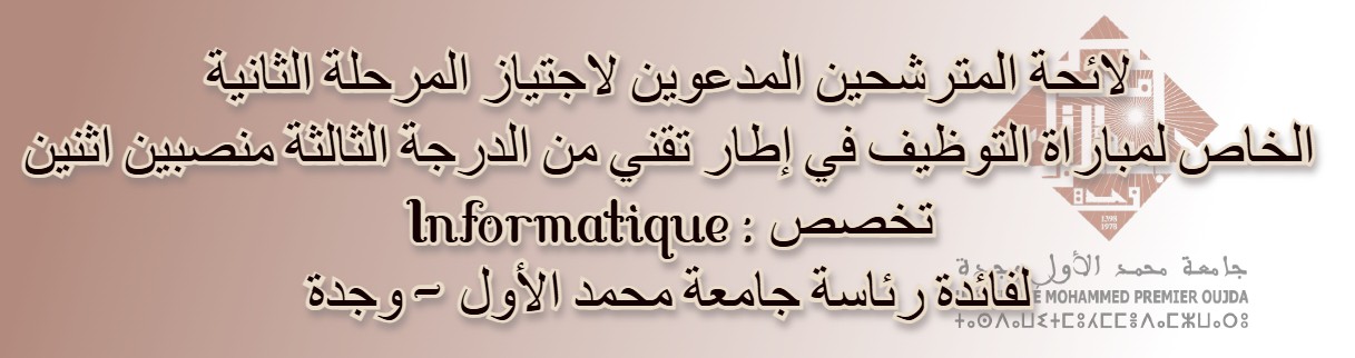 Informatique - لائحة المترشحين المدعوين لاجتياز المرحلة الثانية الخاص لمباراة التوظيف في إطار تقني من الدرجة الثالثة - منصبين اثنين - لفائدة رئاسة جامعة محمد الأول - وجدة