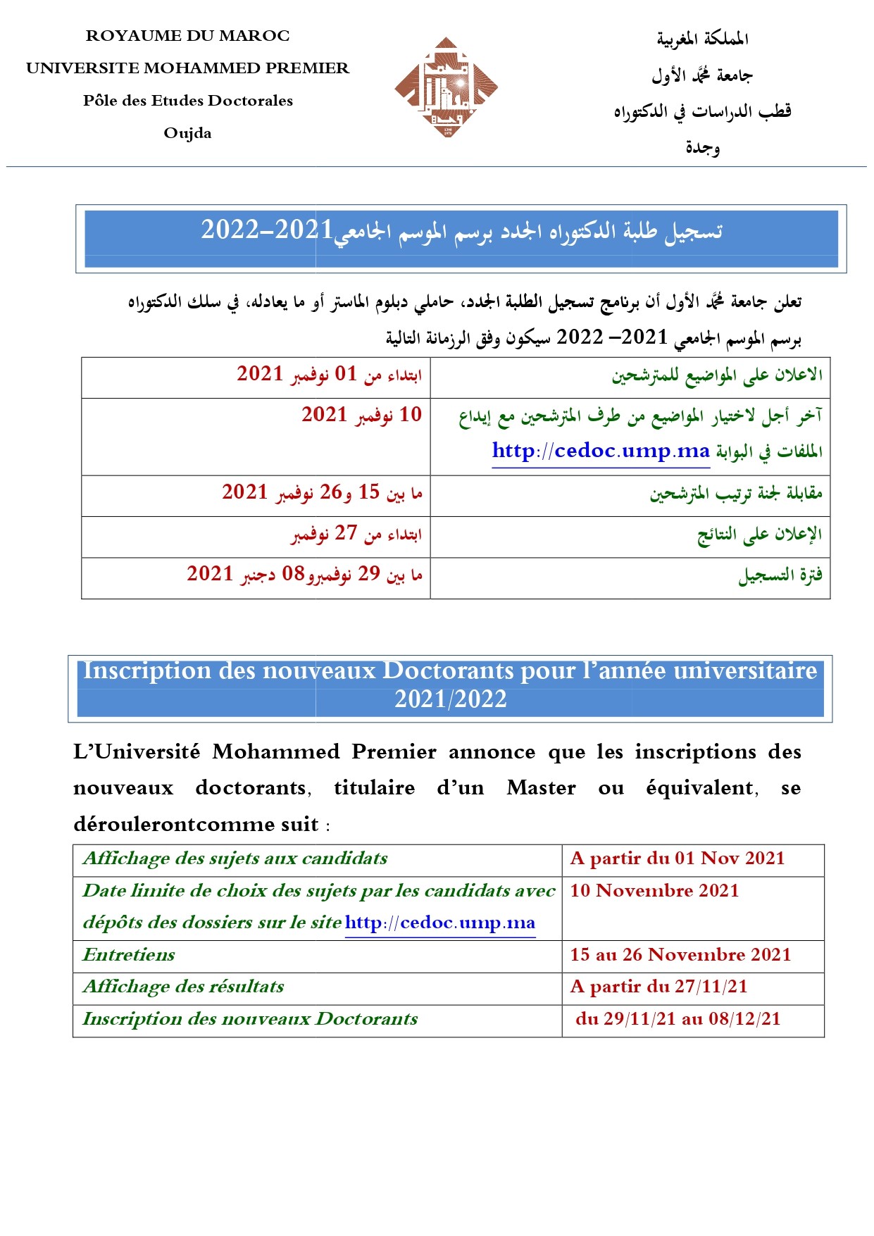 Inscription des nouveaux Doctorants pour l’année universitaire 2021/2022