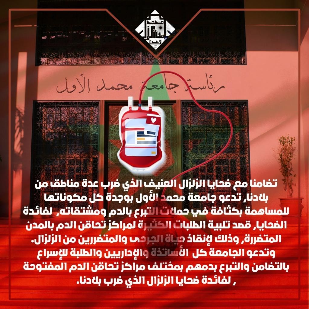 ودعت، كذلك، كل الأساتذة والإداريين والطلبة للإسراع بالتضامن والتبرع بدمهم بمختلف مراكز تحاقن الدم المفتوحة لفائدة ضحايا الزلزال الذي ضرب بلدنا.