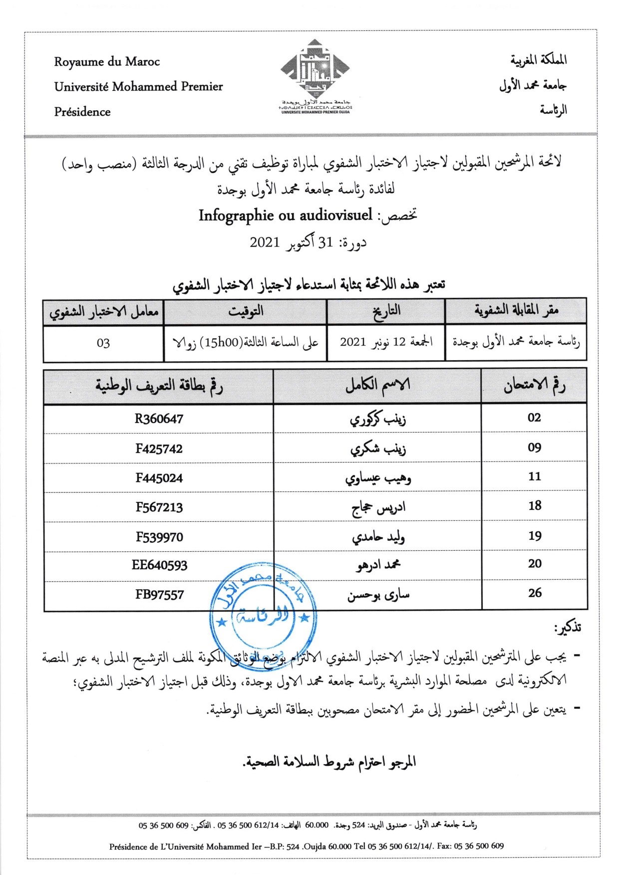 لائحة المدعوين لاجتياز الاختبار الشفوي