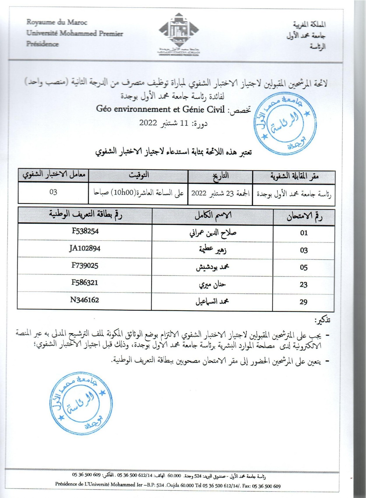 لائحة المرشحين المقبولين لاجتياز الاختبار الشفوي لمباراة توظيف متصرف من الدرجة الثانية