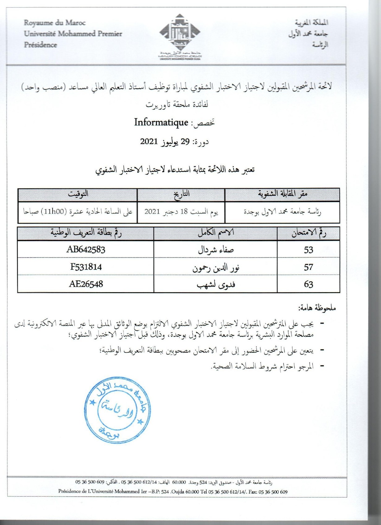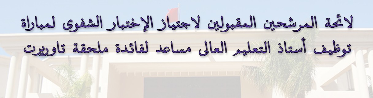 لائحة المرشحين المقبولين لاجتياز الإختبار الشفوي لمباراة توظيف أستاذ التعليم العالي مساعد لفائدة ملحقة تاوريرت
