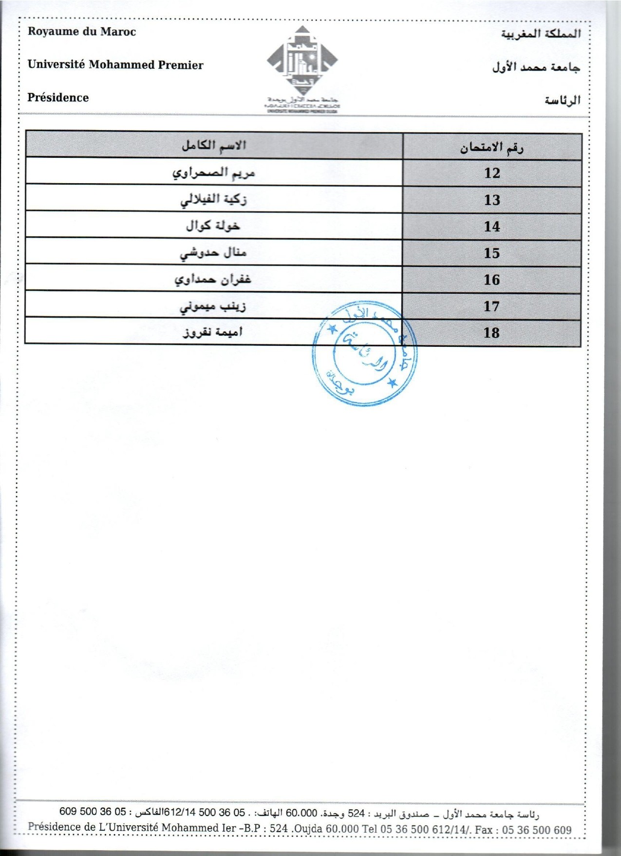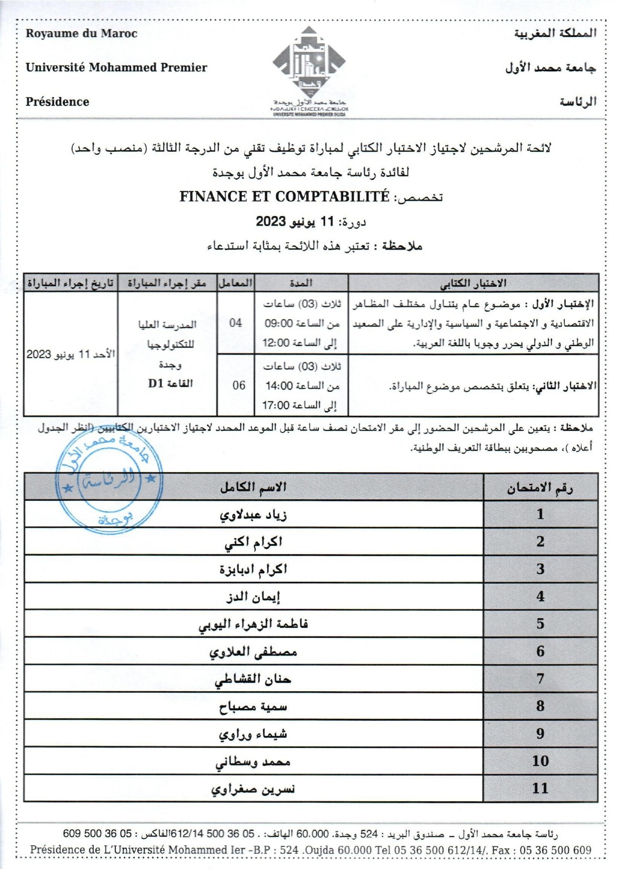 لائحة المرشحين لاجتياز الاختبار الكتابي لمباراة تقني من الدرجة الثالثة لفائدة رئاسة جامعة محمد الأول بوجدة
