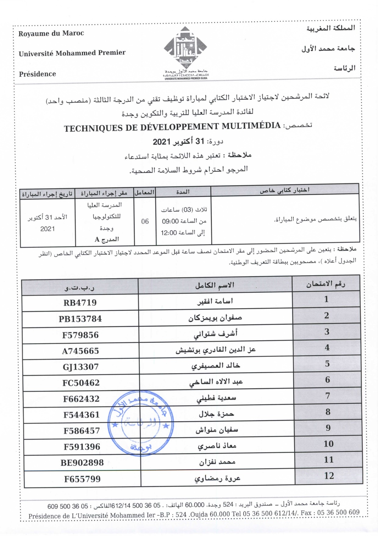لائحة المرشحين لاجتياز الاختبار الكتابي لمباراة توظيف تقني من الدرجة الثالثة