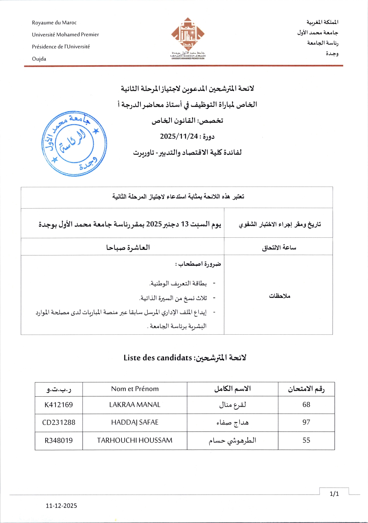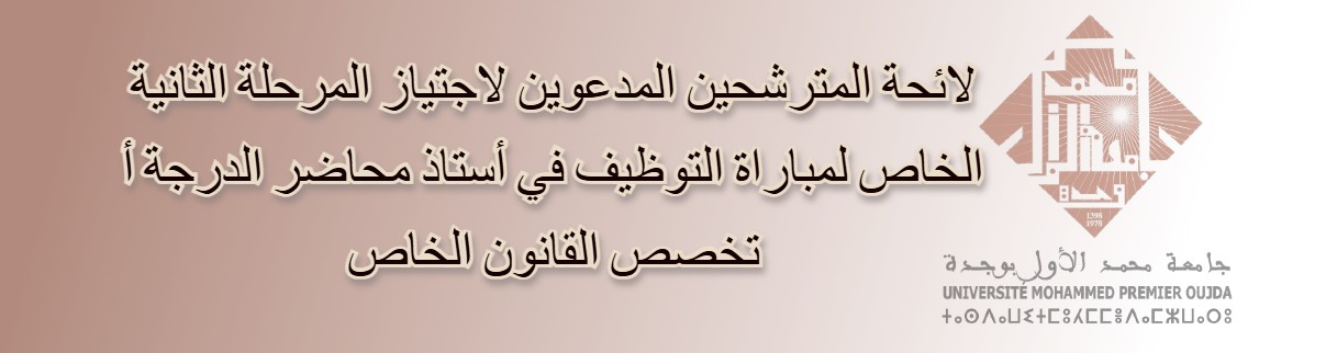لائحة المترشحين المدعوين لاجتياز المرحلة الثانية الخاص لمباراة التوظيف في أستاذ محاضر الدرجة أ, تخصص القانون الخاص