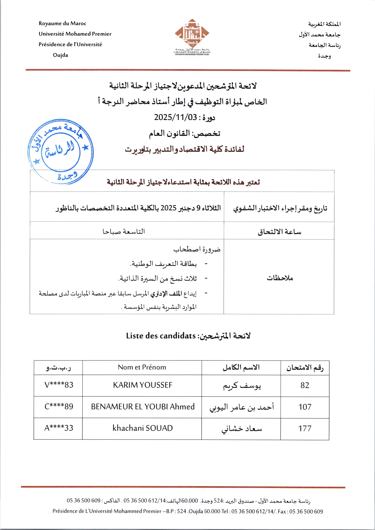 لائحة المترشحين المدعوين لاجتياز المرحلة الثانية الخاص لمباراة التوظيف في إطار أستاذ محاضر الدرجة أ