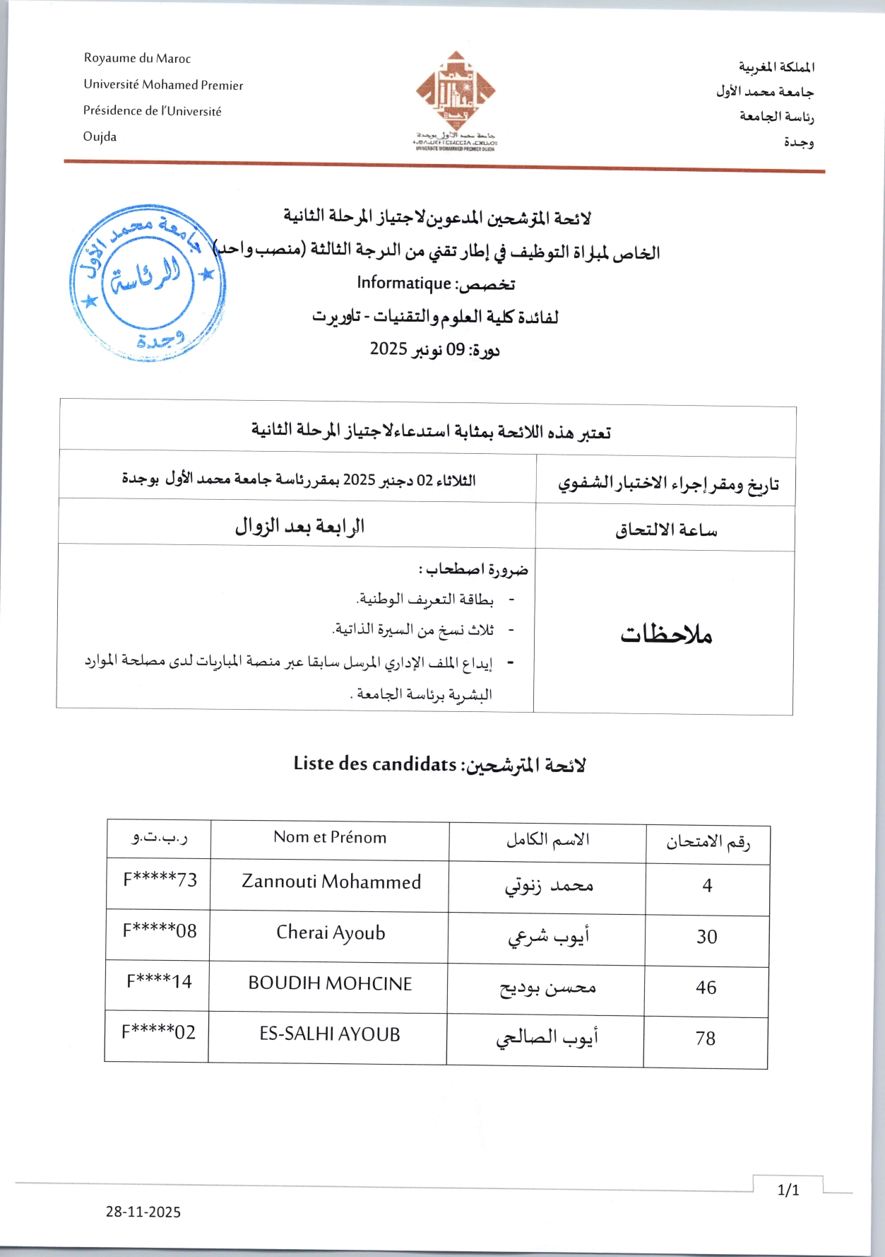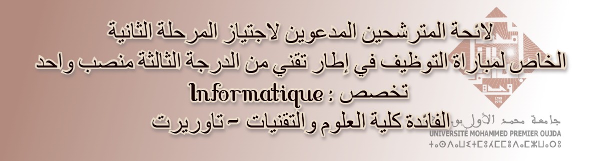 لائحة المترشحين المدعوين لاجتياز المرحلة الثانية الخاص لمباراة التوظيف في إطار تقني من الدرجة الثالثة منصب واحد لفائدة كلية العلوم والتقنيات - تاوريرت