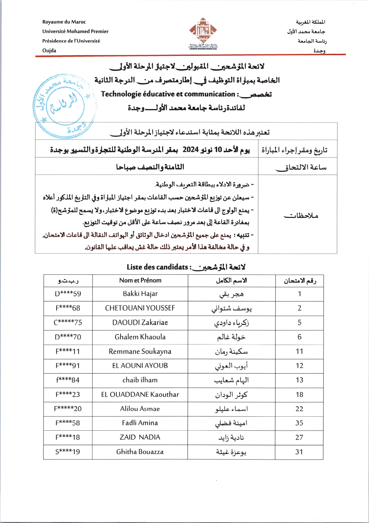لائحة المترشحين المقبولين لاجتياز الاختبار الكتابي Technologie éducative et communication