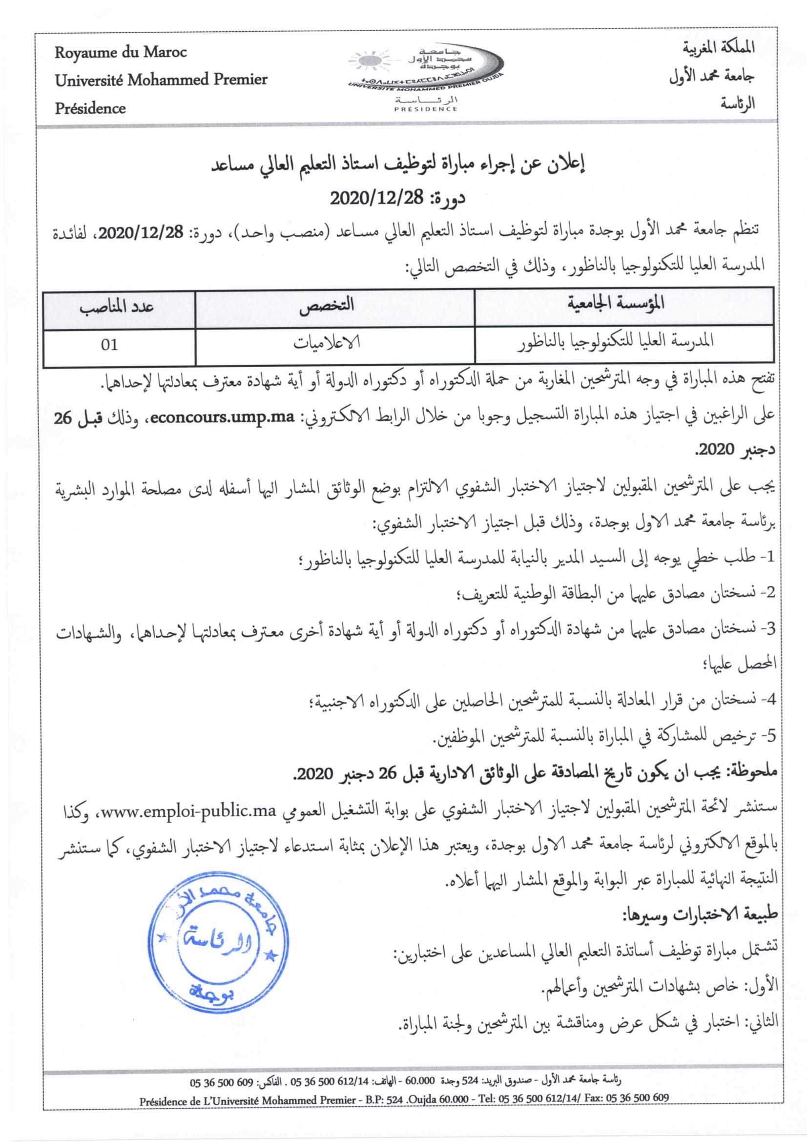 مباراة توظيف استاذ التعليم العالي مساعد دورة: 28/12/2020