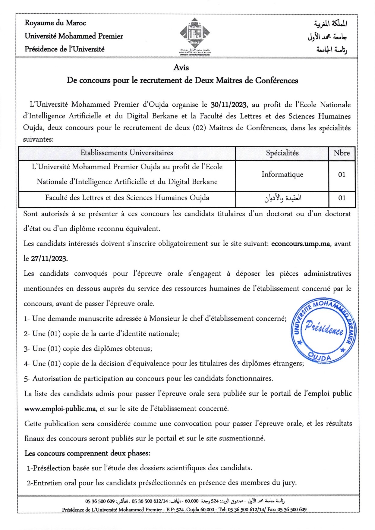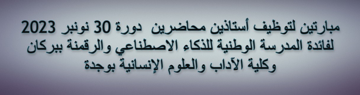 مبارتين لتوظيف أستاذين محاضرين دورة 30 نونبر 2023، لفائدة المدرسة الوطنية للذكاء الاصطناعي والرقمنة ببركان وكلية الآداب والعلوم الإنسانية بوجدة