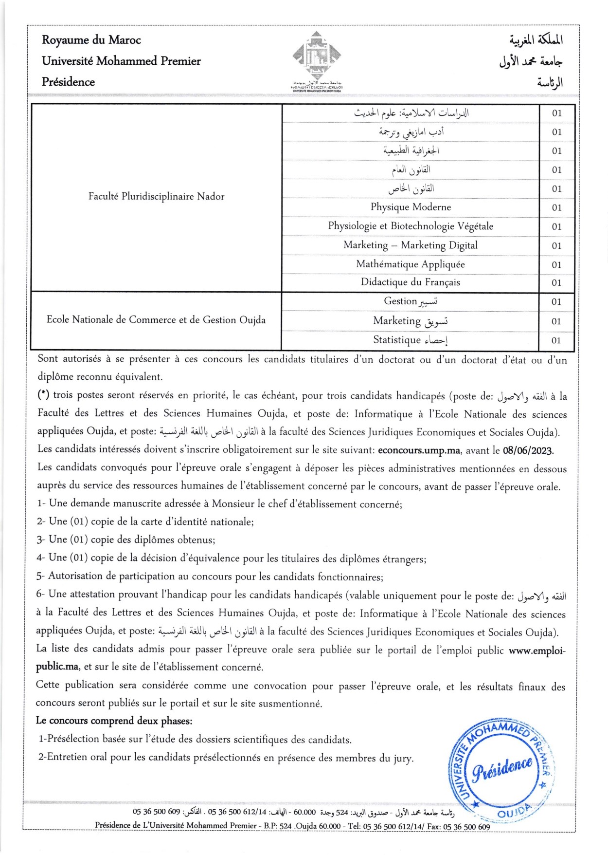مباريات توظيف أساتذة التعليم العالي المساعدين، لفائدة المؤسسات الجامعية التابعة لجامعة محمد الاول بوجدة، دورة 22 يونيو 2023.