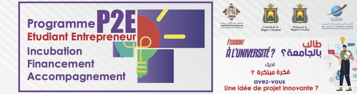 - P2E est un programme qui vise l’encouragement de l’entrepreneuriat à l’Université Mohammed Premier. A travers un ensemble d’outils, il s’agira de favoriser l’incubation de projets et d’encourager la créativité et l’innovation. Le programme vous accompagne de l’idée à la création de l’entreprise. Ce programme est le résultat d’une convention entre :