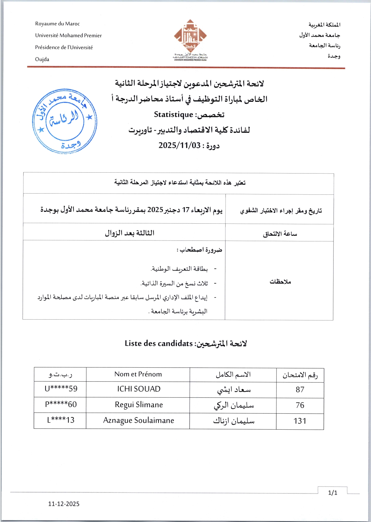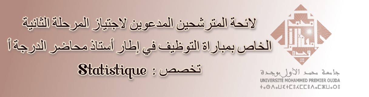Statistique : لائحة المترشحين المدعوين لاجتياز المرحلة الثانية الخاص بمباراة التوظيف في إطار أستاذ محاضر الدرجة أ, تخصص