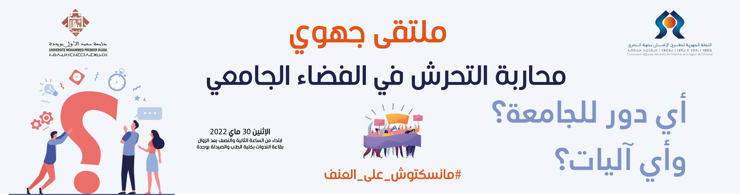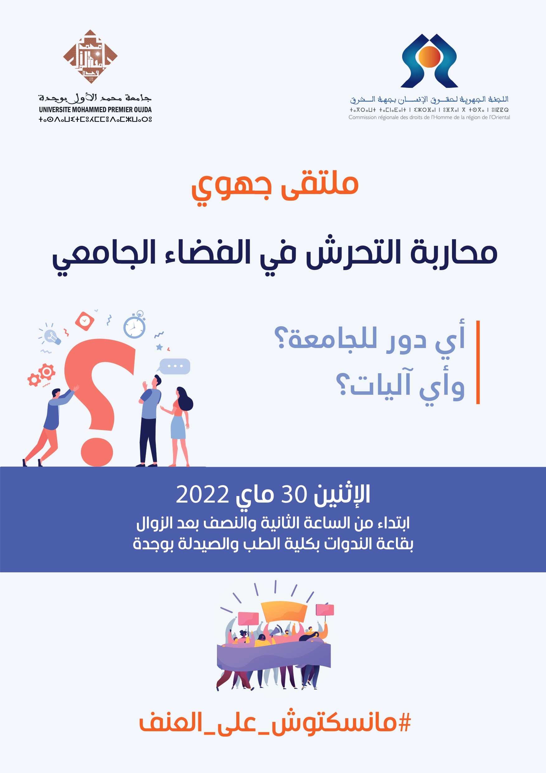 تنظم اللجنة الجهوية لحقوق الإنسان بجهة الشرق، بشراكة مع جامعة محمد الأول بوجدة ملتقى جهويا في موضوع : " محاربة التحرش في الفضاء الجامعي: أي دور للجامعة ؟ و أي آليات؟ "، وذلك يوم الاثنين 30 ماي 2022 انطلاقا من الساعة الثانية والنصف بعد الزوال بقاعة الندوات بكلية الطب والصيدلة بوجدة.