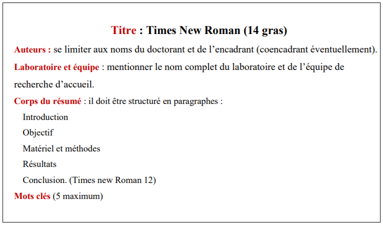 - Les communications doivent traiter le sujet de thèse avec une présentation des résultats obtenus.