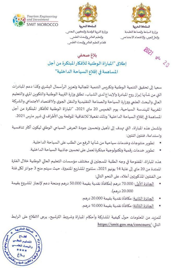 المباراة الوطنية للأفكار المبتكرة من أجل المساهمة في إقلاع السياحة الداخلية