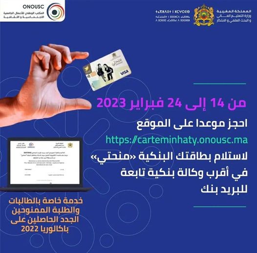 يمكن للطالبات والطلبة الممنوحين الجدد حاملي بكالوريا 2022 والمسجلين بالكلية أو المدرسة ، اختيار تاريخ ومكان استلام البطاقة البنكية "منحتي" بإحدى وكالات البريد بنك عبر الرابط التاليhttps://carteminhaty.onousc.ma وذلك ابتداءً من يوم الثلاثاء 14 فبراير 2023 إلى غاية يوم الجمعة 24 فبراير .2023