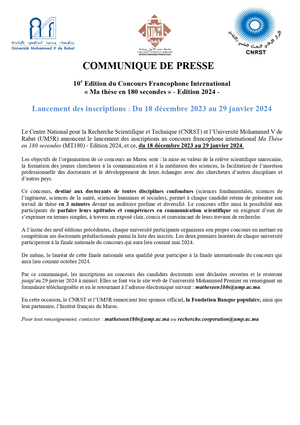COMMUNIQUE DE PRESSE 10e Edition du Concours Francophone International « Ma thèse en 180 secondes » - Edition 2024 - Fiche d’inscription
