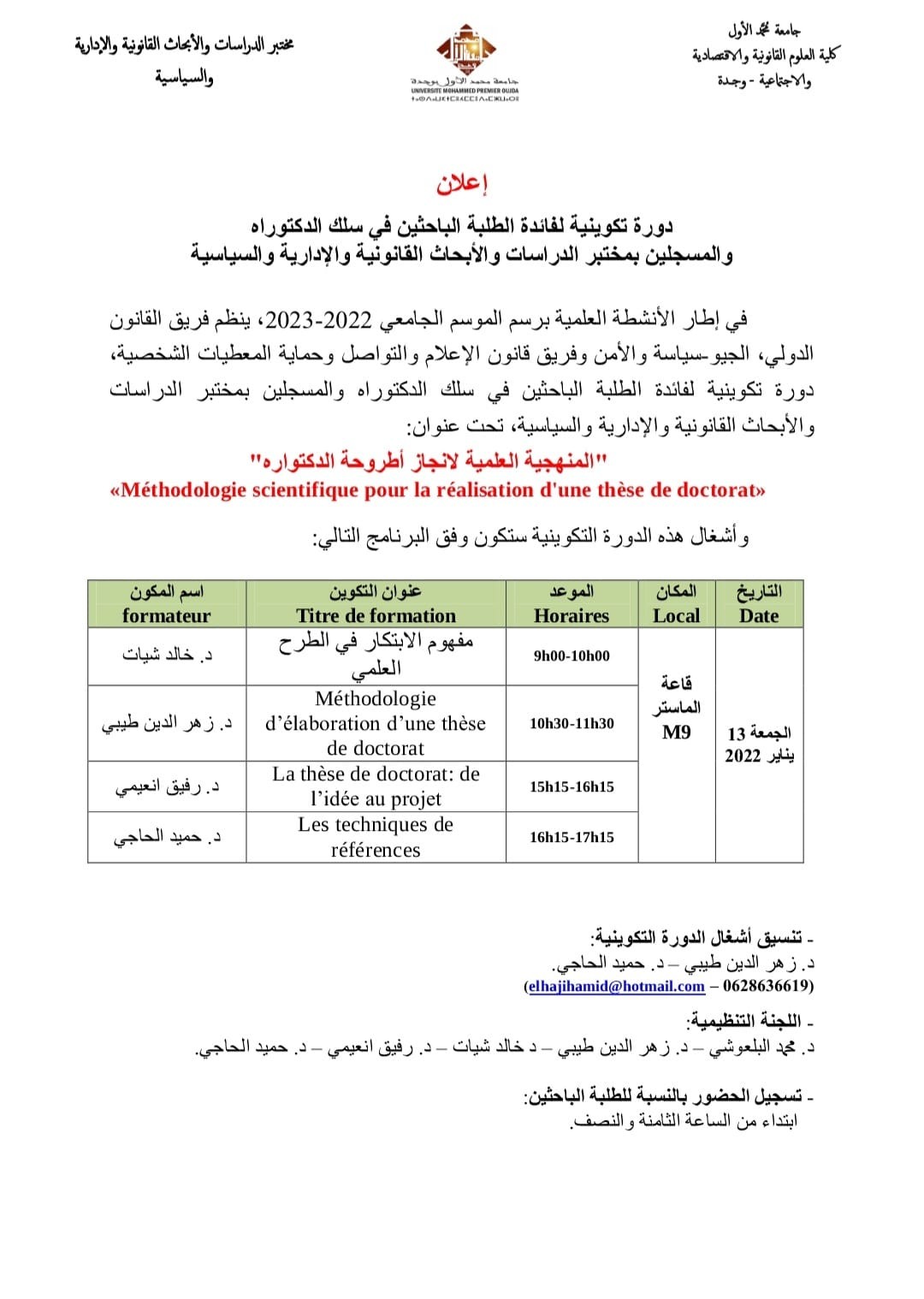 دورة تكوينية لفائدة الطلبة الباحثين في سلك الدكتوراه و المسجلين بمختبر الدراسات و الأبحاث القانونية
