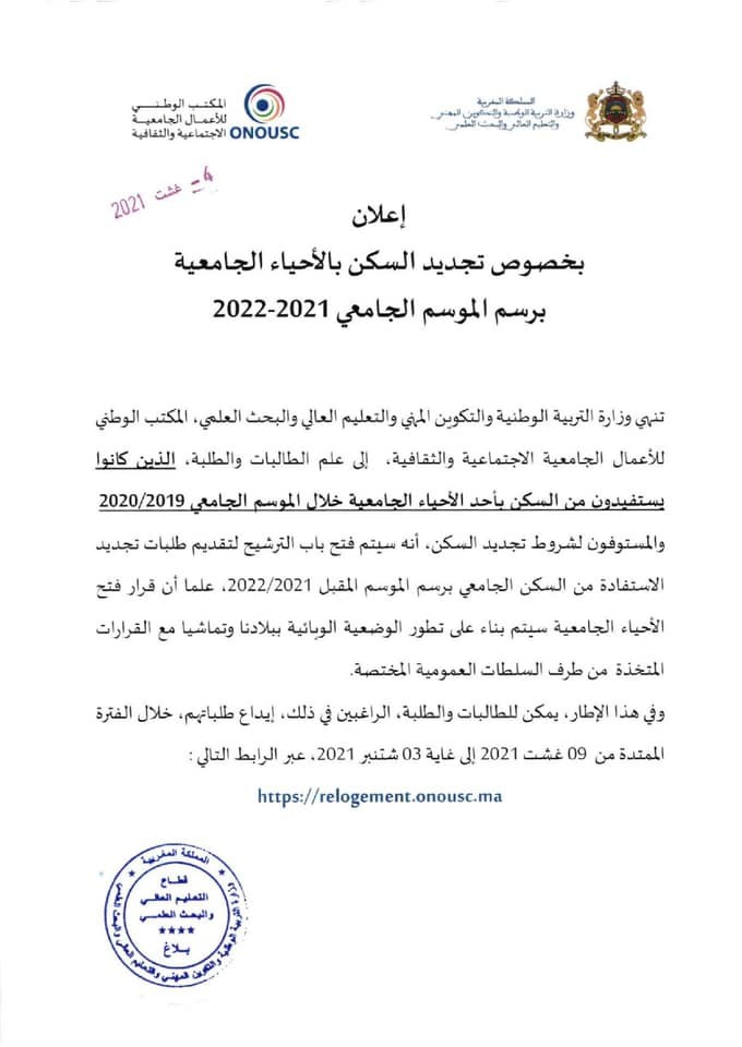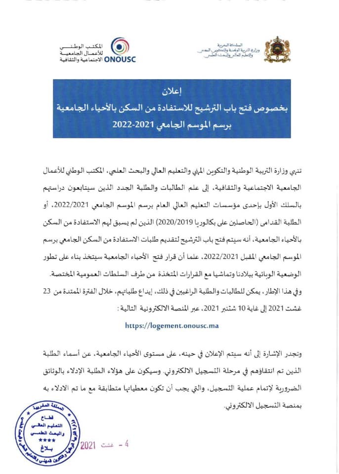 فتح باب الترشيح للاستفادة وتجديد السكن بالأحياء الجامعية برسم الموسم الجامعي 2021-2022