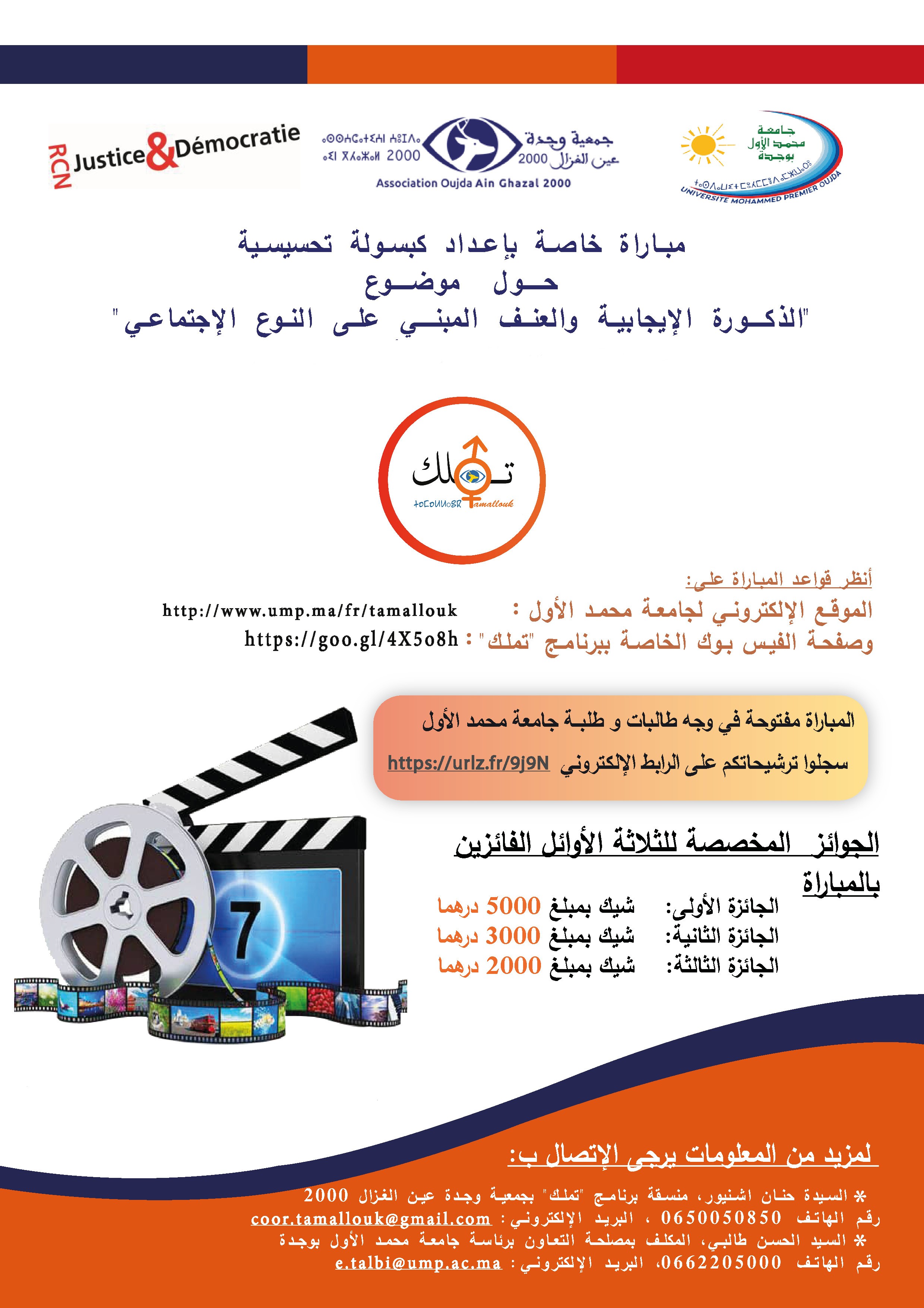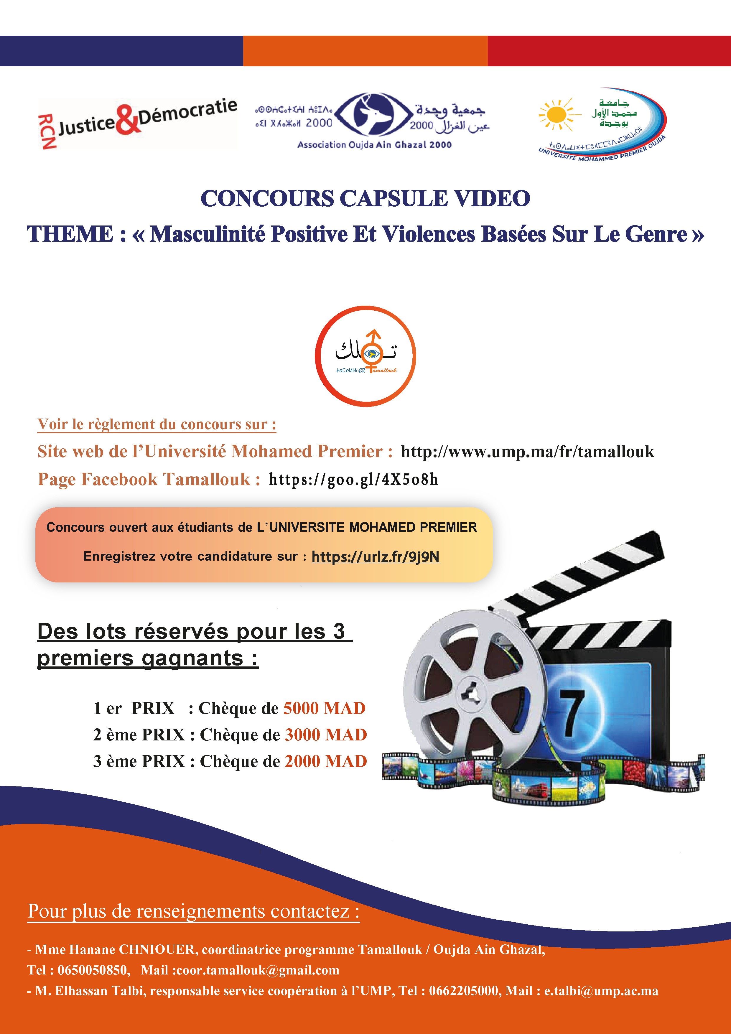 Dans le cadre du programme TAMALLOUK, qui vise à contribuer aux changements des attitudes sociales et judiciaires face aux violences basées sur le genre (VBG) dans la Région de l’Oriental au Maroc, l’association Oujda Ain Ghazal 2000 et RCN J&D, conjointement avec l’Université Mohamed Premier (UMP), lancent un concours auprès des étudiants de l’UMP pour la conception d’une capsules vidéo qui témoigne sur l’intégration positive des hommes comme facteur de réduction des violences basées sur le genre.