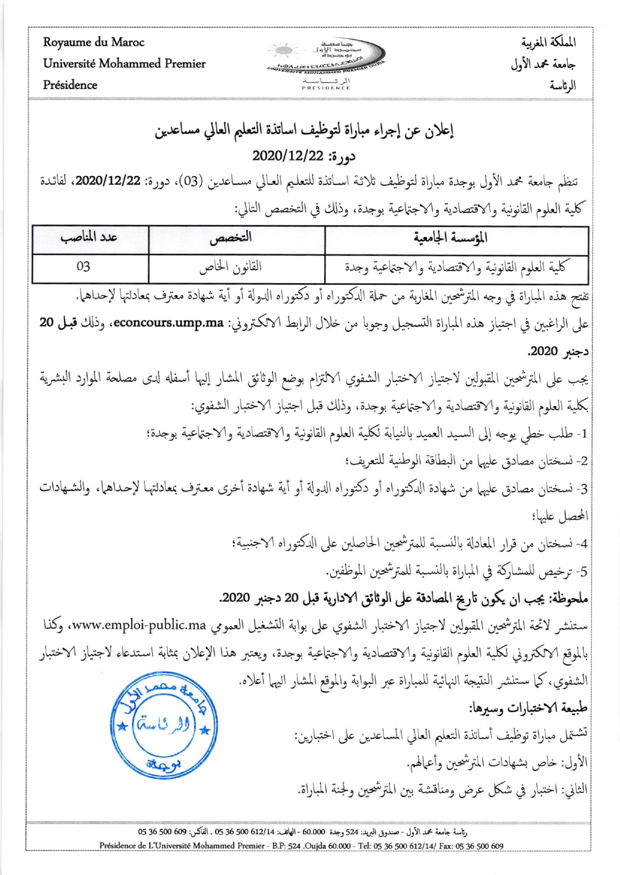 إعلان عن إجراء مباراة لتوظيف اساتذة التعليم العالي مساعدين - القانون الخاص
