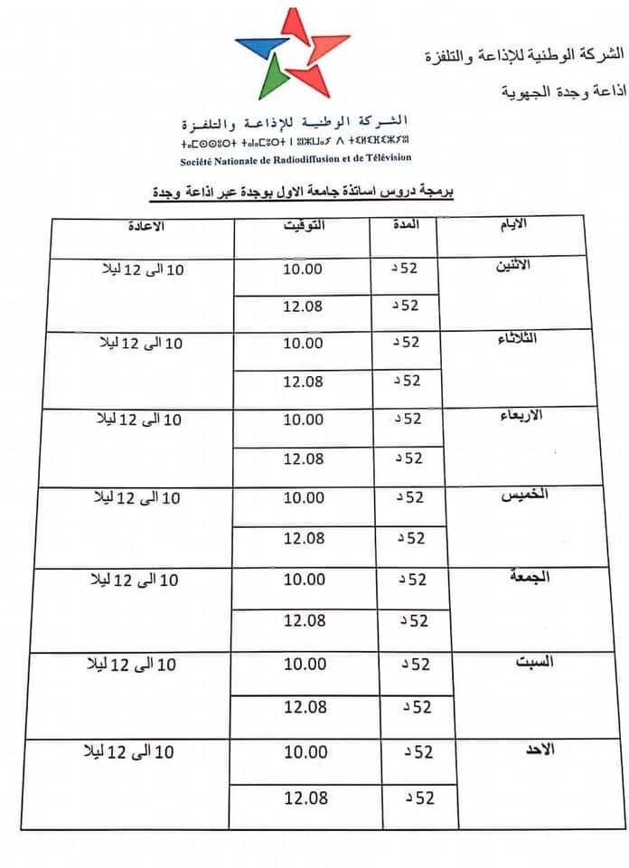 يخبر رئيس جامعة محمد الأول بوجدة كافة الطلبة، أنه بتنسيق مع الشركة الوطنية للإذاعة والتلفزة، وفي إطار اعتماد الدراسة عن بعد، سوف تشرع محطة إذاعة وجدة الجهوية ابتداء من الأسبوع المقبل في تقديم 4 محاضرات يومية مدة كل واحدة منها 26 دقيقة، موجهة لطلبة كلية العلوم القانونية والاقتصادية والاجتماعية، وطلبة كلية الآداب والعلوم الانسانية، بجامعة محمد الأول بوجدة، وفق برنامج سوف يتم الإعلان عليه لاحقا، وذلك من الاثنين إلى الأحد من الساعة 10 إلى الساعة 10و52 د ومن الساعة 12 و 8 دقائق إلى الواحدة بعد الزوال، مع إعادة يومية من 10 الى 12 ليلا. وذلك في إطار الجهود المبذولة من طرف جامعة محمد الأول بوجدة لفائدة طلبتها، في ظل هذه الظرفية الدقيقة التي تجتازها بلادنا.