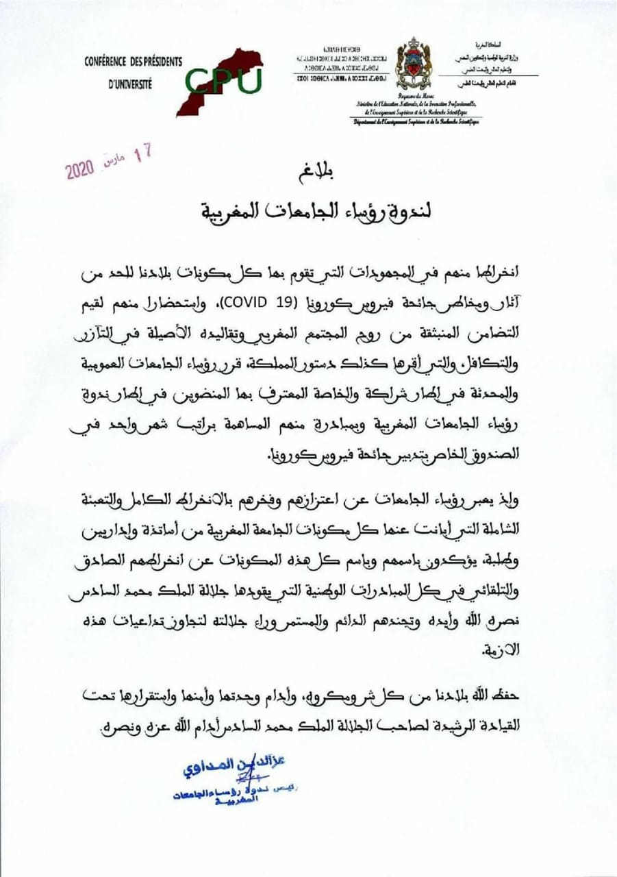 بلاغ لندوة رؤساء الجامعات المغربية