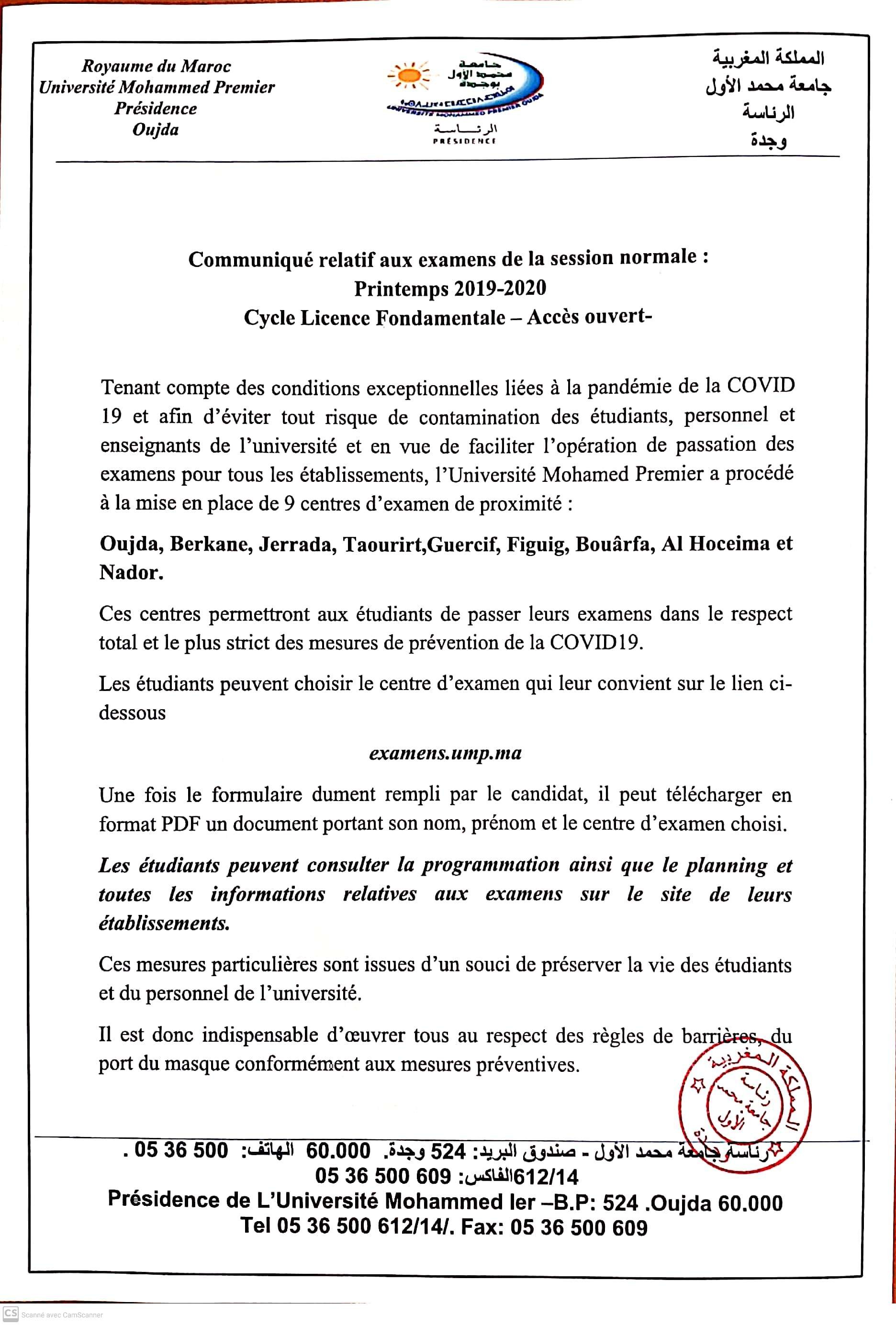 Communiqué relatif aux examens de la session normale: Printemps 2019/2020